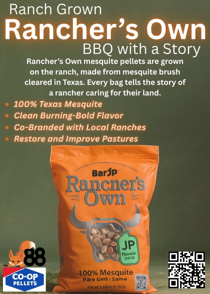 “Rancher’s Own” mesquite pellets are our BBQ pellet blends. Our mesquite pellets are grown on the ranch, made from mesquite brush cleared in Texas. Every bag tells the story of a rancher caring for their land.